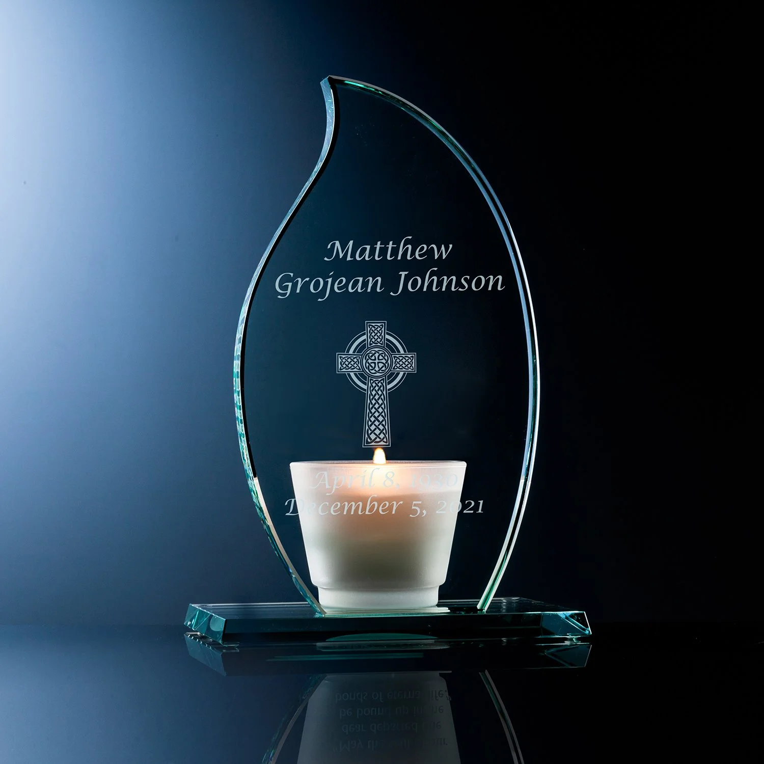 Description: Hand polished glass Flame, Celtic Cross etched (your choice of position) includes name, dates, and candle in frosted votive on a glass base. Please note we can add anything that exists as clip art to your customized piece.