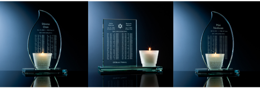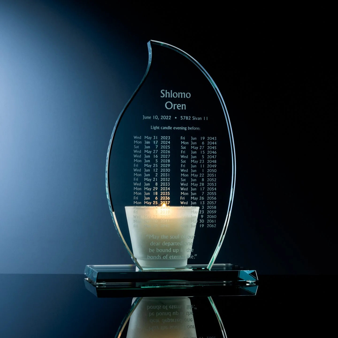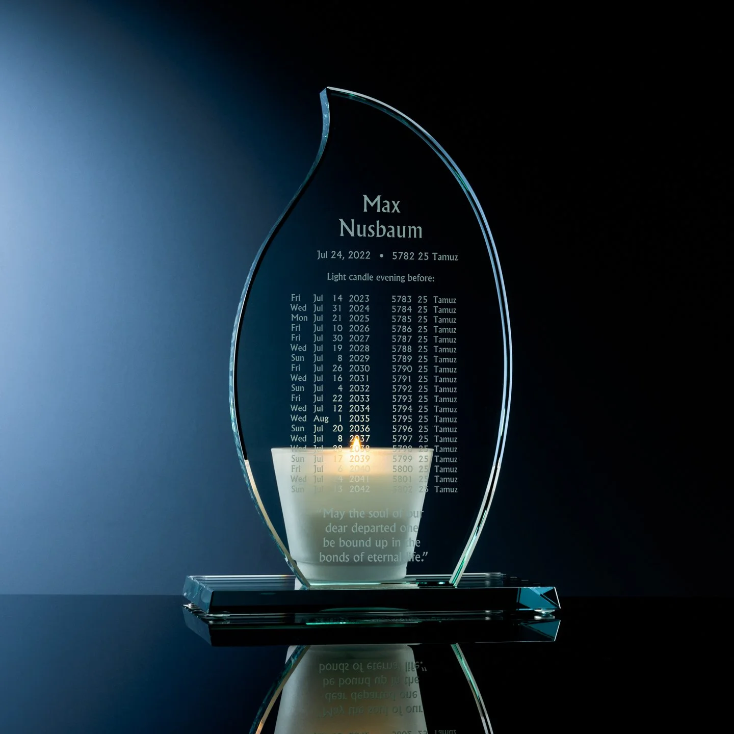 Our signature piece, the Light of Remembrance, is a handcrafted glass Yahrzeit calendar that honours loved ones for decades. Each calendar is etched into polished glass and set on a base with a frosted holder containing a kosher Yahrzeit candle.