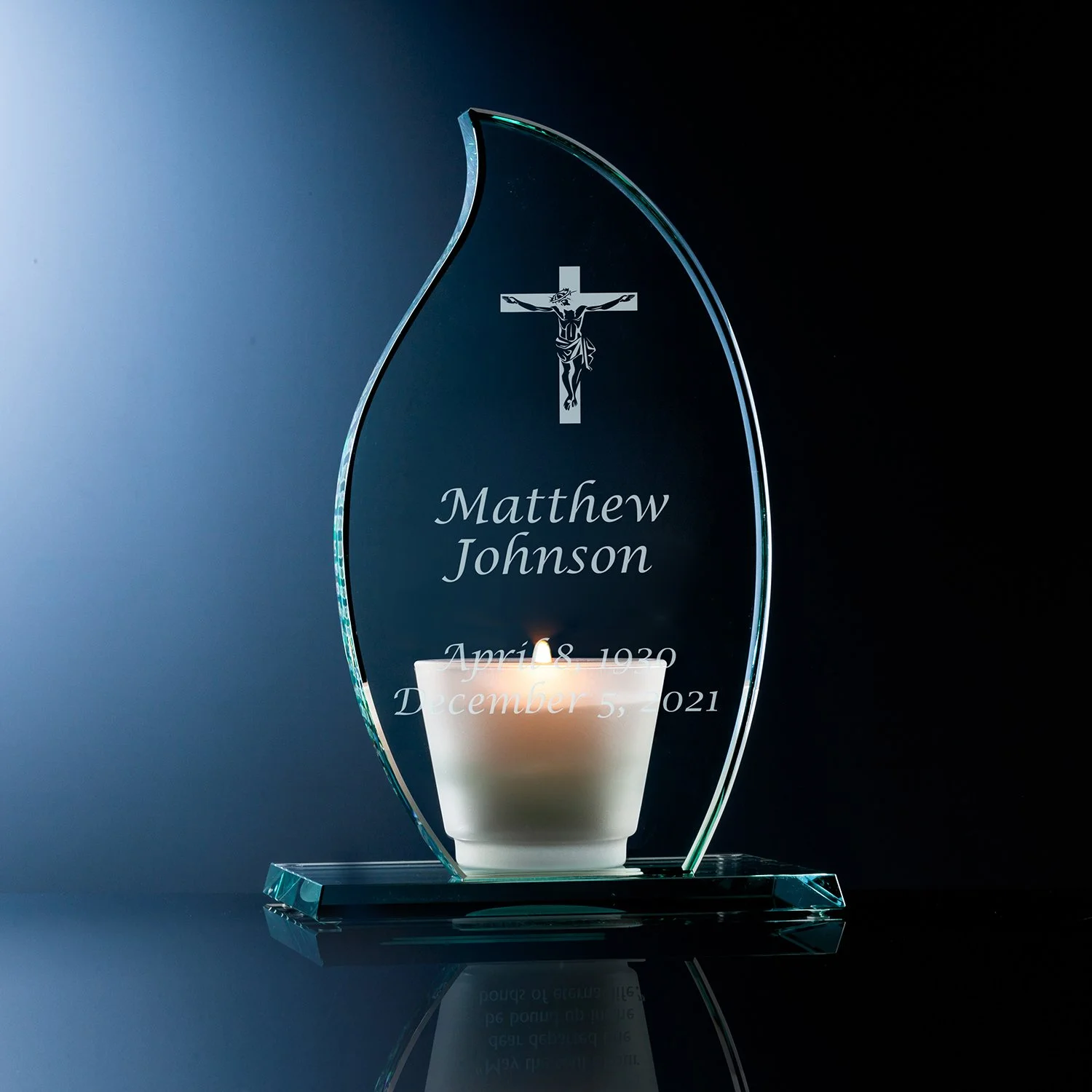 Description: Hand polished glass Flame, Crucifix etched (your choice of position) includes name, dates, and candle in frosted votive on a glass base. Ask about availability in other languages.